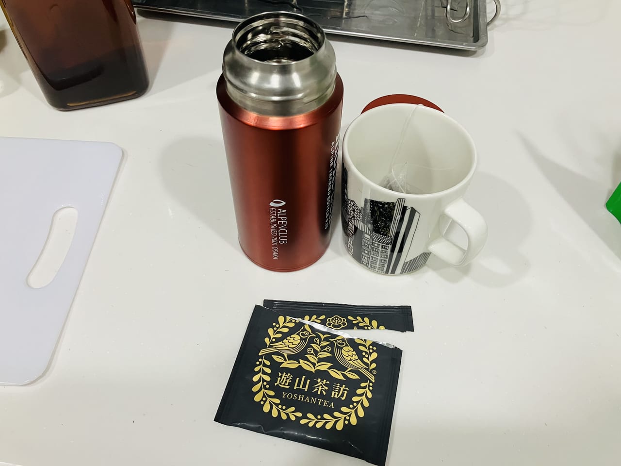 温かいお茶も持って行きました。友達からもらったお土産の台湾茶。美味しい。60分〜90分に1度休憩時間があるので、ゆっくり飲めます。