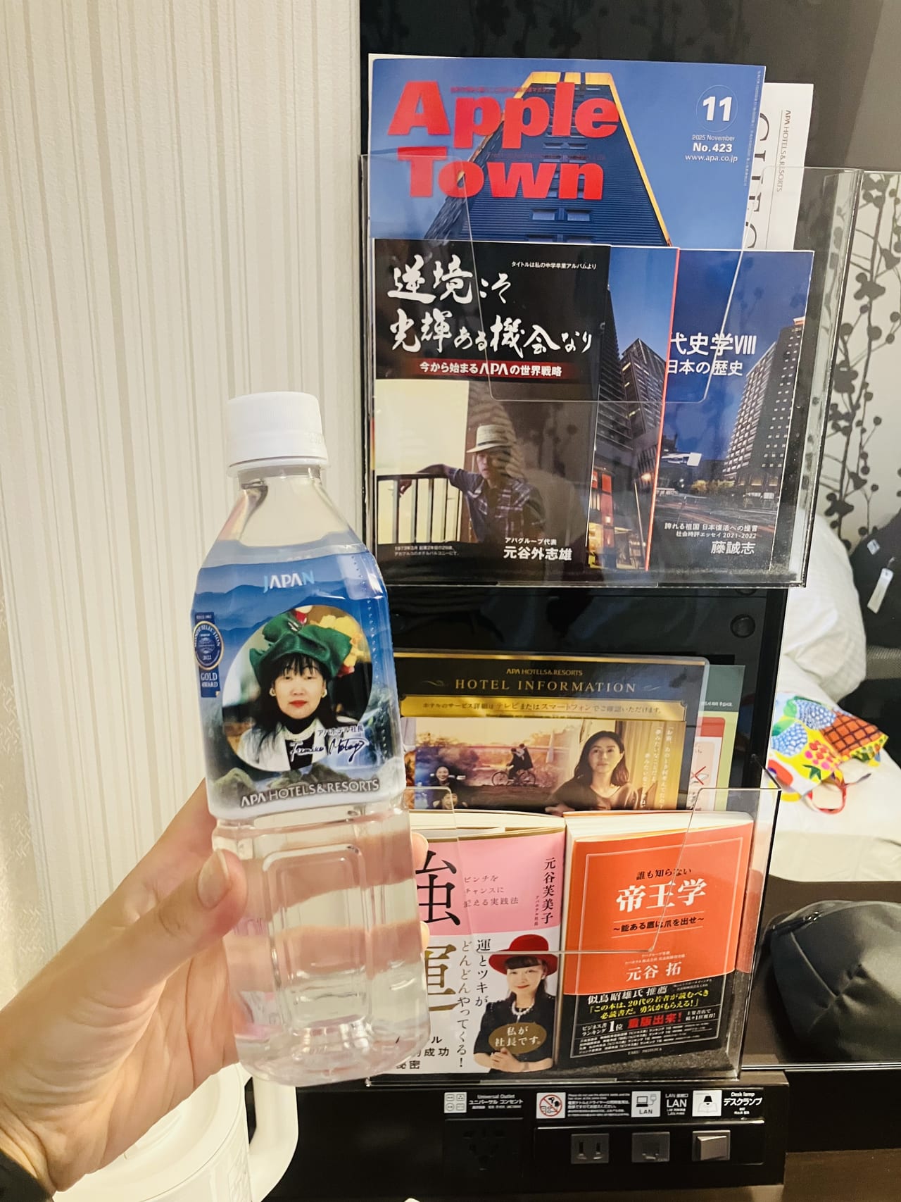 水のボトルは社長のお顔入り。本もたくさん置いてありました。